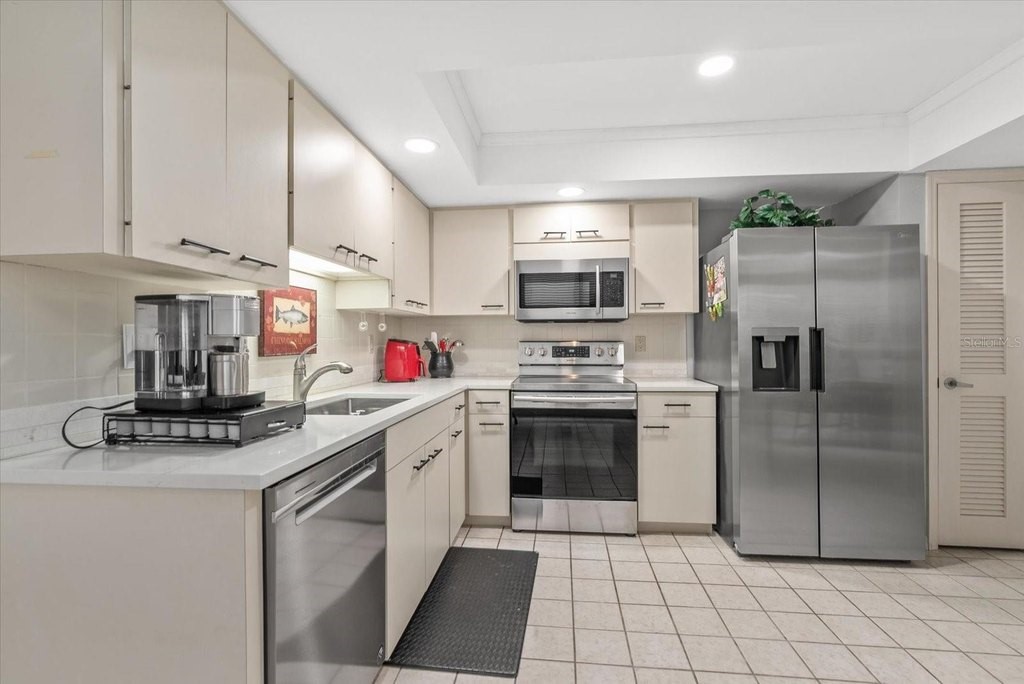 Lakeshore Village | 2 Bed / 2 Bath Villa | 55+ Community From the moment you step inside, serene lake views and soaring cathedral ceilings set the tone for this beautifully renovated 2-bedroom, 2-bath villa in the sought-after Lakeshore Village community ? minutes from the world-famous white sands of Siesta Key. Thoughtfully reimagined in 2023, this villa was taken down to the studs in all the right places. The kitchen was opened to the living area and completely transformed with quartz countertops, new cabinetry, designer backsplash, stainless appliances, updated lighting, and a new ceiling with fan. Both baths received full upgrades including granite countertops, new sinks, faucets, and shower doors ? and the primary bath now features a luxurious soaking tub. New flooring flows throughout. Three oversized skylights and abundant windows bathe the interior in natural light, while three large sliding glass doors retract fully to connect the living space to a 23-foot tiled lanai ? expanding the total living area to over 1,800 sq. ft. The split-bedroom floor plan offers privacy for owners and guests alike, and the inside laundry room adds everyday convenience. A 2-car garage with overhead storage completes the package.